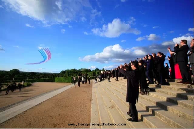 傍晚(wǎn),微風(fēng),貴賓在(zài)凡爾賽宮的(de)法(fǎ)式庭院(yuàn)雞尾酒(jiǔ)会(huì)中(zhōng)欣賞了(le)法(fǎ)國(guó)空(kōng)軍特(tè)技飛行表(biǎo)演隊的(de)精彩表(biǎo)演(他(tā)们(men)是(shì)世界上(shàng)成(chéng)立最(zuì)早的(de)特(tè)技飛行表(biǎo)演隊之(zhī)一(yī))。紅(hóng)白(bái)藍(lán),三(sān)色(sè)的(de)煙霧(wù)彩带(dài),劃(huà)过(guò)了(le)凡爾賽皇宮的(de)清(qīng)澈上(shàng)空(kōng),同(tóng)樣(yàng)演繹了(le)法(fǎ)式生(shēng)活藝術(shù)的(de)精彩。